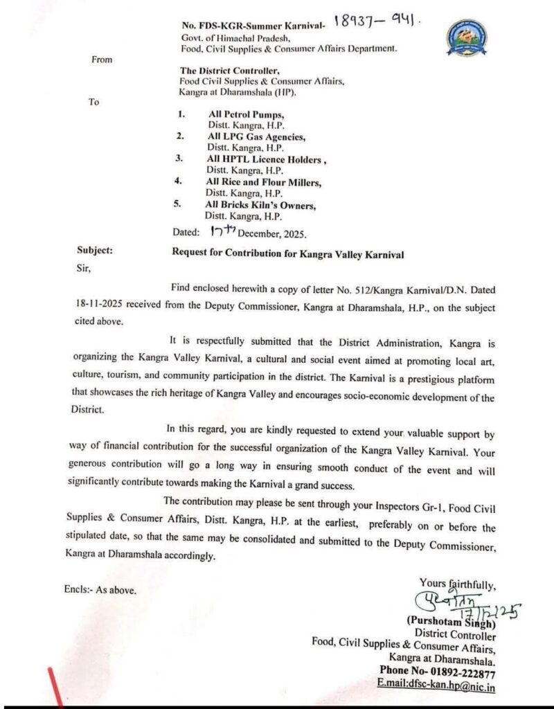सुधीर शर्मा ने कहा कि कांगड़ा वैली कार्निवल के नाम पर पेट्रोल पंप, एलपीजी गैस एजेंसियों, राइस एवं फ्लोर मिलर्स, ईंट भट्ठा मालिकों और अन्य लाइसेंसधारकों से सरकारी पत्र जारी कर आर्थिक योगदान मांगा जाना बेहद शर्मनाक है। यह पत्र इस बात का जीवंत प्रमाण है कि कांग्रेस सरकार किस तरह से प्रशासनिक ताकत का गलत इस्तेमाल कर रही है।