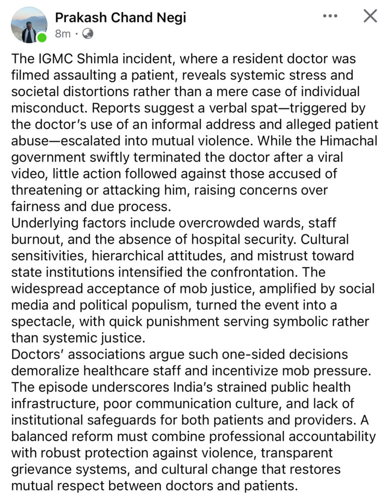 डॉ. नेगी बताते हैं कि उपलब्ध रिपोर्ट्स के मुताबिक, एक मामूली मौखिक विवाद—जो डॉक्टर द्वारा अनौपचारिक संबोधन और कथित मरीज दुर्व्यवहार से शुरू हुआ—धीरे-धीरे दोनों पक्षों के बीच हिंसा में बदल गया। वायरल वीडियो सामने आने के बाद हिमाचल सरकार ने डॉक्टर की सेवाएं तत्काल समाप्त कर दीं, लेकिन जिन लोगों पर डॉक्टर को धमकाने या उस पर हमला करने के आरोप लगे, उनके खिलाफ कोई ठोस कार्रवाई न होना निष्पक्षता और ड्यू प्रोसेस पर गंभीर सवाल खड़े करता है।