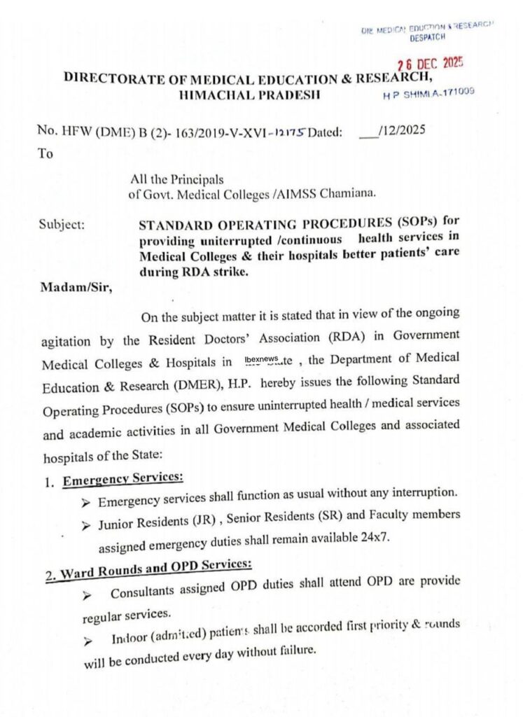 रेजिडेंट डॉक्टर्स एसोसिएशन (RDA) की हड़ताल के बीच हिमाचल प्रदेश सरकार ने कड़ा रुख अपनाते हुए साफ कर दिया है कि अस्पतालों में इलाज किसी भी सूरत में नहीं रुकेगा। निदेशालय चिकित्सा शिक्षा एवं अनुसंधान (DMER) ने प्रदेश के सभी सरकारी मेडिकल कॉलेजों और अस्पतालों के लिए अनिवार्य SOP जारी करते हुए डॉक्टरों को 24×7 सेवाओं में तैनात रहने का आदेश दिया है।