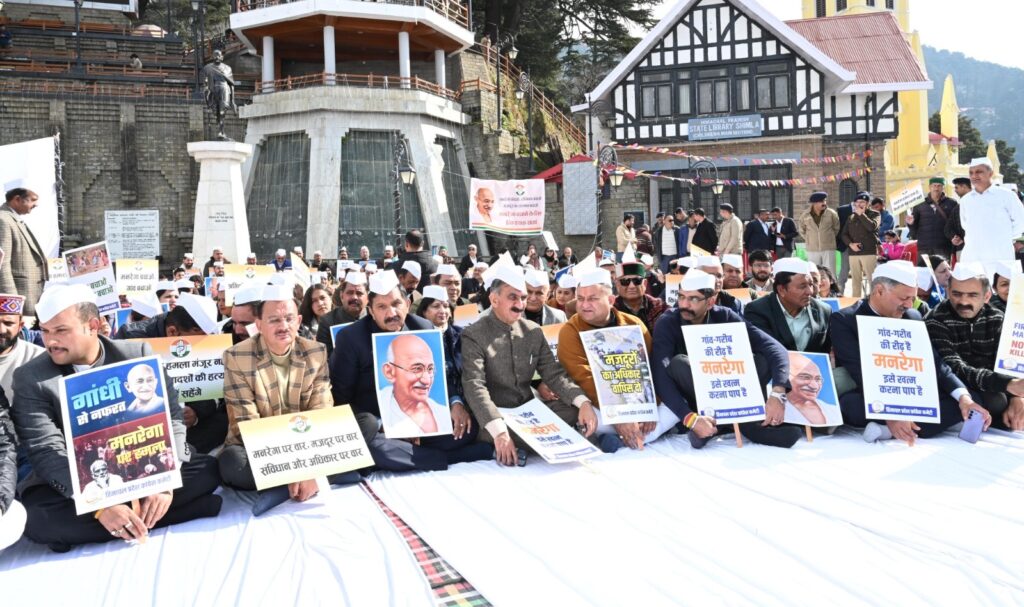 मुख्यमंत्री ठाकुर सुखविन्द्र सिंह सुक्खू ने आज रिज मैदान शिमला में महात्मा गांधी की प्रतिमा के पास केन्द्र सरकार द्वारा मनरेगा को समाप्त करने के विरोध में अपने मंत्रिमंडल के सहयोगियों के साथ धरना दिया।