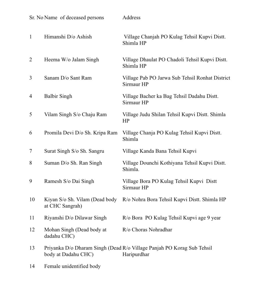हादसे में सनम (20) पुत्री संत राम (पब, शिलाई), बिलम सिंह (44) पुत्र छज्जू राम (जुडो शिलाल, कुपवी), हिमांशी (6) पुत्री आशीष (चंजाह, कुपवी), हिमा (50) पत्नी सुंदर सिंह (धौलत, कुपवी), बस चालक बलबीर तोमर (52) पुत्र मोहर सिंह (ढांग, ददाहू), प्रोमिला (21) पुत्री कृपा राम (चंजाह, कुपवी), सूरत सिंह (60) पुत्र शांगरू (कांडा बनाह, कुपवी), सुमन (28) पुत्री रण सिंह (डोची, कुपवी), रमेश (35) पुत्र देई सिंह (बोहरा कुलाग, कुपवी), कियान पुत्र बिलम (बोरा, कुपवी), रियांशी पुत्री दिलावर सिंह (बोरा), मोहन सिंह (चौरास, नौहराधार), प्रियंका पुत्री धर्म सिंह (पंजाह, हरिपुरधार) और एक अज्ञात महिला की मौत हुई है।