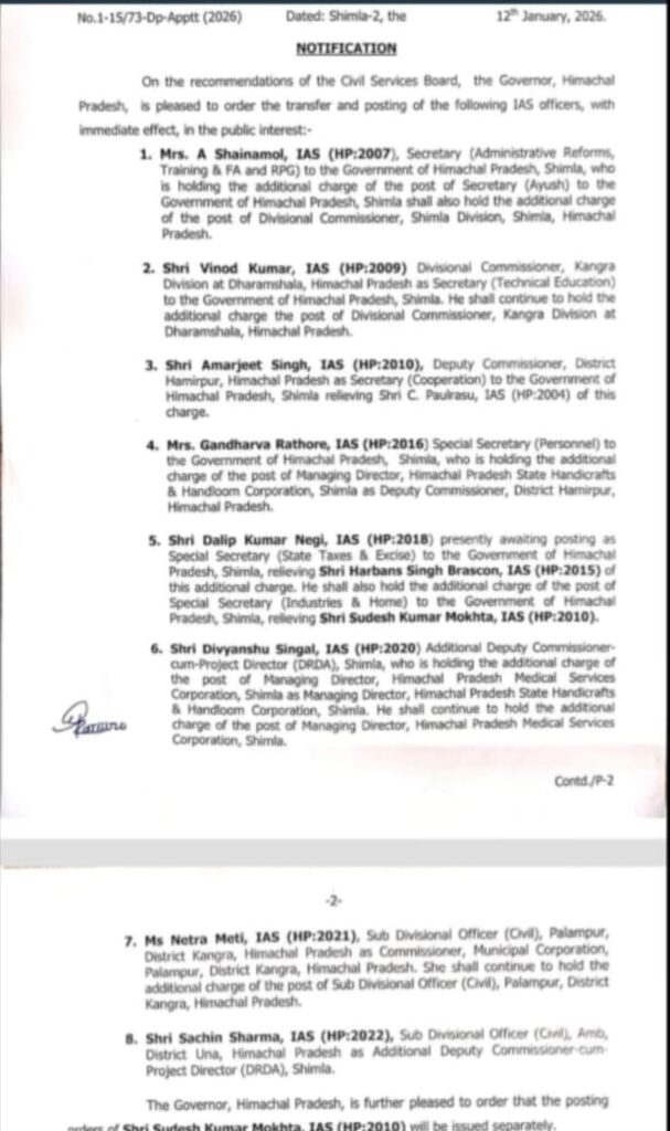 जारी आदेशों के तहत विभिन्न विभागों, मंडलों, जिलों और सरकारी उपक्रमों में कार्यरत कई वरिष्ठ अधिकारियों को नई जिम्मेदारियाँ सौंपी गई हैं, जबकि कुछ अधिकारियों को अतिरिक्त प्रभार दिया गया है। प्रशासनिक फेरबदल के माध्यम से सरकार का उद्देश्य शासन-प्रशासन की कार्यप्रणाली में तेजी लाना और विकास कार्यों के प्रभावी क्रियान्वयन को सुनिश्चित करना बताया गया है।जारी अधिसूचना के अनुसार IAS अधिकारी ए. शाइनामोल को प्रशासनिक सुधार, प्रशिक्षण एवं एफए व आरपीजी विभाग की सचिव के रूप में तैनात करते हुए उन्हें शिमला मंडल के आयुक्त का अतिरिक्त प्रभार सौंपा गया है। कांगड़ा मंडल के आयुक्त विनोद कुमार को तकनीकी शिक्षा विभाग का सचिव नियुक्त किया गया है, जबकि वे कांगड़ा मंडलायुक्त का अतिरिक्त दायित्व निभाते रहेंगे।