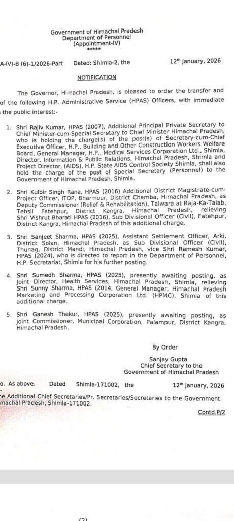 इसके अलावा HPAS अधिकारियों के भी तबादले किए गए हैं। राजीव कुमार को कार्मिक विभाग में विशेष सचिव का अतिरिक्त प्रभार सौंपा गया है। कुलबीर सिंह राणा को राहत एवं पुनर्वास के उपायुक्त के रूप में तैनात किया गया है। संजीत शर्मा को थुनाग का एसडीएम, सुमेध शर्मा को संयुक्त निदेशक स्वास्थ्य सेवाएं तथा गणेश ठाकुर को पालमपुर नगर निगम में संयुक्त आयुक्त नियुक्त किया गया है।