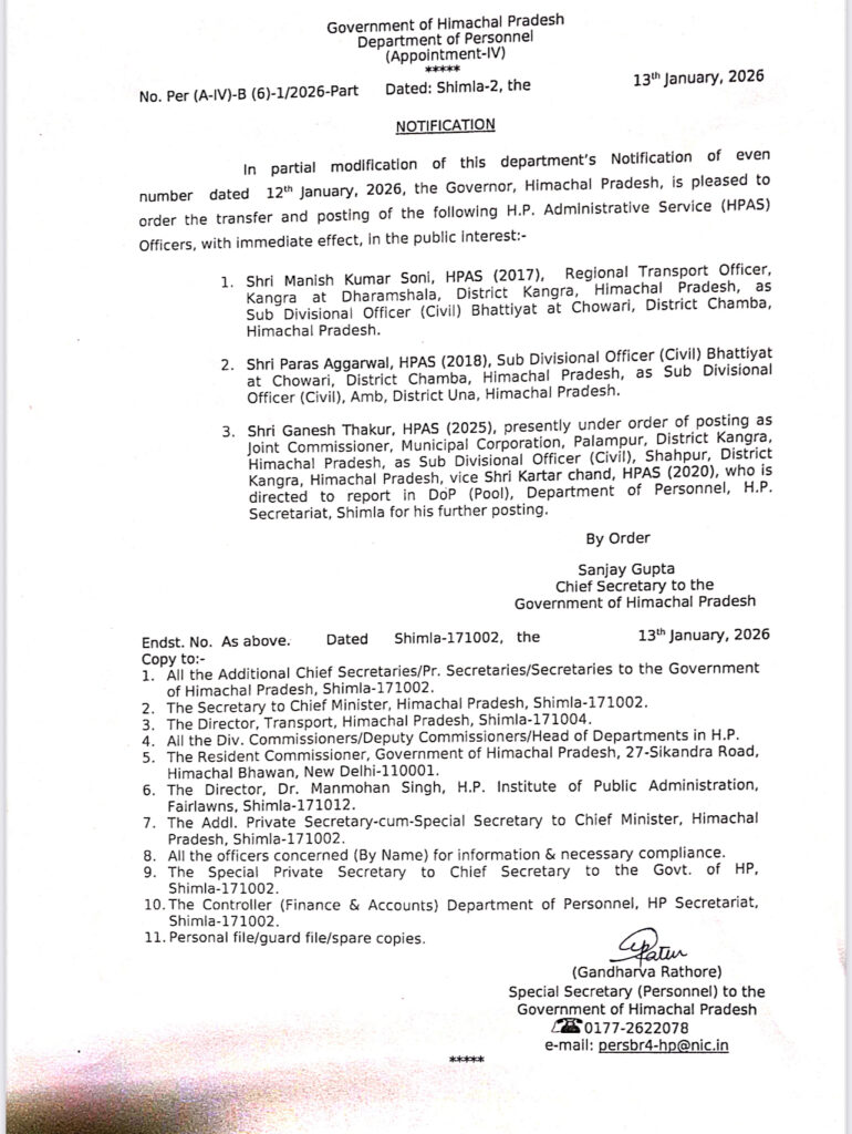 अधिसूचना के अनुसार, श्री मनीष कुमार सोनी, HPAS (2017) को क्षेत्रीय परिवहन अधिकारी, कांगड़ा (धर्मशाला) से स्थानांतरित कर उप मंडल अधिकारी (नागरिक), भटियात, चुवाड़ी (जिला चंबा) नियुक्त किया गया है। वहीं श्री पारस अग्रवाल, HPAS (2018) को उप मंडल अधिकारी (नागरिक), भटियात (चुवाड़ी) से स्थानांतरित कर उप मंडल अधिकारी (नागरिक), अंब, जिला ऊना लगाया गया है।