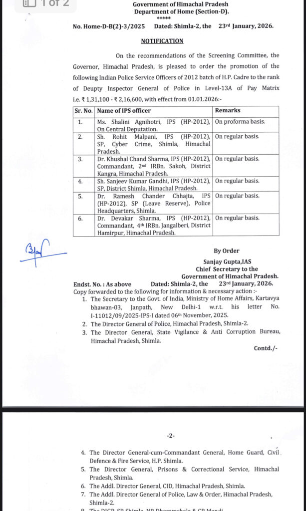 हिमाचल प्रदेश सरकार ने गणतंत्र दिवस से पहले पुलिस सेवा में अहम प्रशासनिक फैसले लेते हुए कई आईपीएस अधिकारियों को पदोन्नति और वेतन लाभ दिया है। सरकार की ओर से जारी अलग-अलग अधिसूचनाओं के अनुसार 2012 बैच के छह आईपीएस अधिकारियों को उप महानिरीक्षक (डीआईजी) बनाया गया है, जबकि 2008 बैच के तीन अधिकारियों को पुलिस महानिरीक्षक (आईजी) के पद पर पदोन्नति दी गई है।