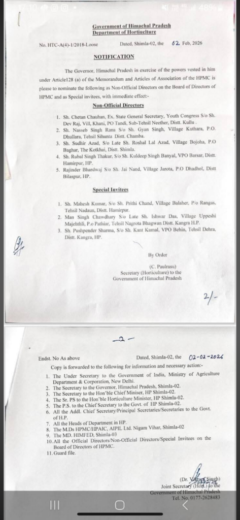 हिमाचल प्रदेश सरकार के बागवानी विभाग ने हिमाचल प्रदेश बागवानी उपज विपणन एवं प्रसंस्करण निगम (HPMC) के निदेशक मंडल में नई नियुक्तियों को लेकर अधिसूचना जारी कर दी है। राज्यपाल ने HPMC के मेमोरेंडम एवं आर्टिकल्स ऑफ एसोसिएशन के तहत प्रदत्त शक्तियों का प्रयोग करते हुए गैर-सरकारी निदेशकों तथा विशेष आमंत्रितों को तत्काल प्रभाव से नामित किया है।