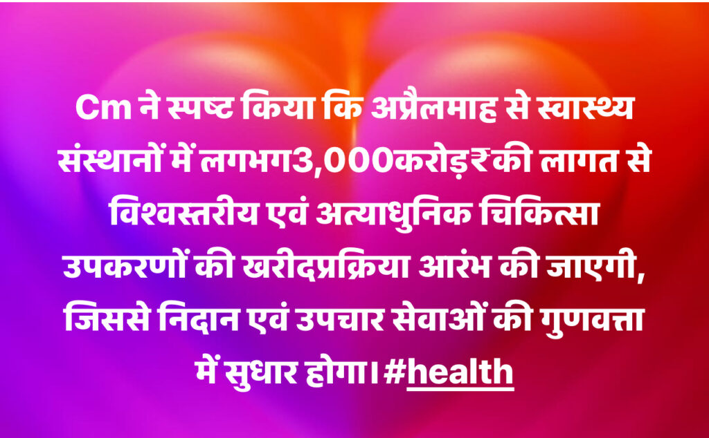 Chief Minister Thakur Sukhvinder Singh Sukhu, while presiding over a review meeting of the Health Department here today, said that the State Government was making continuous efforts to strengthen healthcare services and improve facilities in government health institutions. The Chief Minister said that from April onwards, the process of procuring world-class, technology-enabled medical equipment would be initiated in health institutions across the state, involving an expenditure of about Rs. 3,000 crore. He added that the government was strengthening diagnostic services and addressing the shortage of paramedical staff and doctors to facilitate the patients. The recruitment process to fill vacant posts in health institutions was underway and additional posts would be created as per requirement.