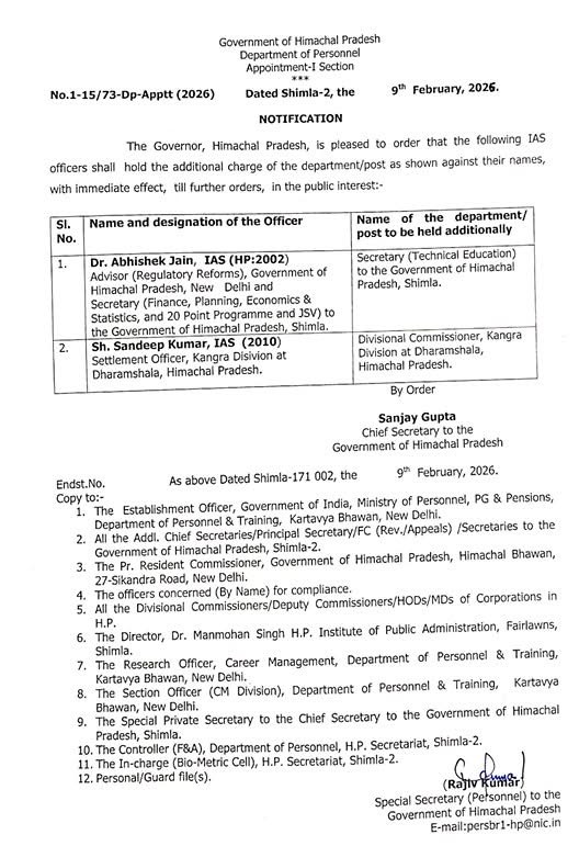 The Government of Himachal Pradesh has issued a notification assigning additional charge of departments/posts to two IAS officers in the public interest, with immediate effect.