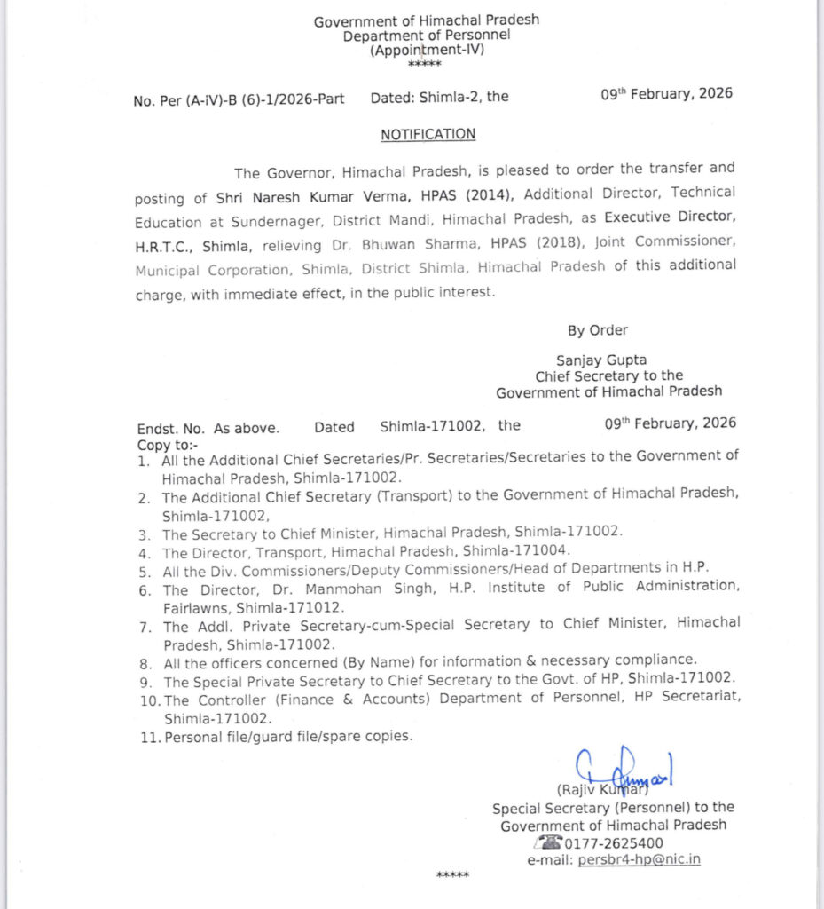 एक अन्य अधिसूचना में नरेश कुमार वर्मा, HPAS (2014) को अतिरिक्त निदेशक, तकनीकी शिक्षा (सुंदरनगर) से स्थानांतरित कर कार्यकारी निदेशक, हिमाचल पथ परिवहन निगम (HRTC), शिमला नियुक्त किया गया है। वे डॉ. भुवन शर्मा, HPAS (2018) से यह अतिरिक्त प्रभार संभालेंगे।