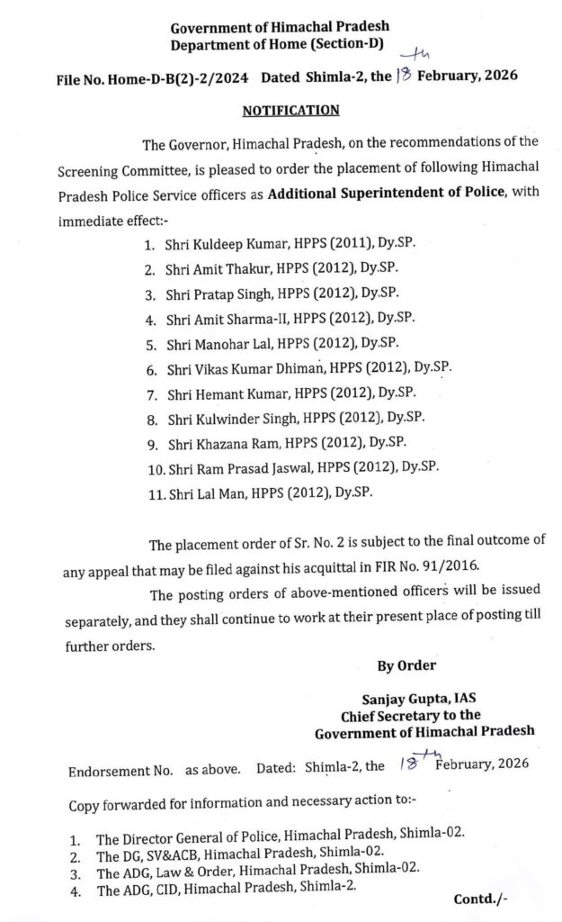 Government of Himachal Pradesh рдиреЗ рдкреБрд▓рд┐рд╕ рдкреНрд░рд╢рд╛рд╕рди рдореЗрдВ рдмрдбрд╝рд╛ рдХрджрдо рдЙрдард╛рддреЗ рд╣реБрдП 11 HPPS (рд╣рд┐рдорд╛рдЪрд▓ рдкреНрд░рджреЗрд╢ рдкреБрд▓рд┐рд╕ рд╕реЗрд╡рд╛) рдЕрдзрд┐рдХрд╛рд░рд┐рдпреЛрдВ рдХреЛ рдЕрддрд┐рд░рд┐рдХреНрдд рдкреБрд▓рд┐рд╕ рдЕрдзреАрдХреНрд╖рдХ (Additional Superintendent of Police) рдХреЗ рдкрдж рдкрд░ рдкрджреЛрдиреНрдирддрд┐/рдкреНрд▓реЗрд╕рдореЗрдВрдЯ рджреА рд╣реИред рдпрд╣ рдЖрджреЗрд╢ рддрддреНрдХрд╛рд▓ рдкреНрд░рднрд╛рд╡ рд╕реЗ рд▓рд╛рдЧреВ рд╣реЛрдЧрд╛ред